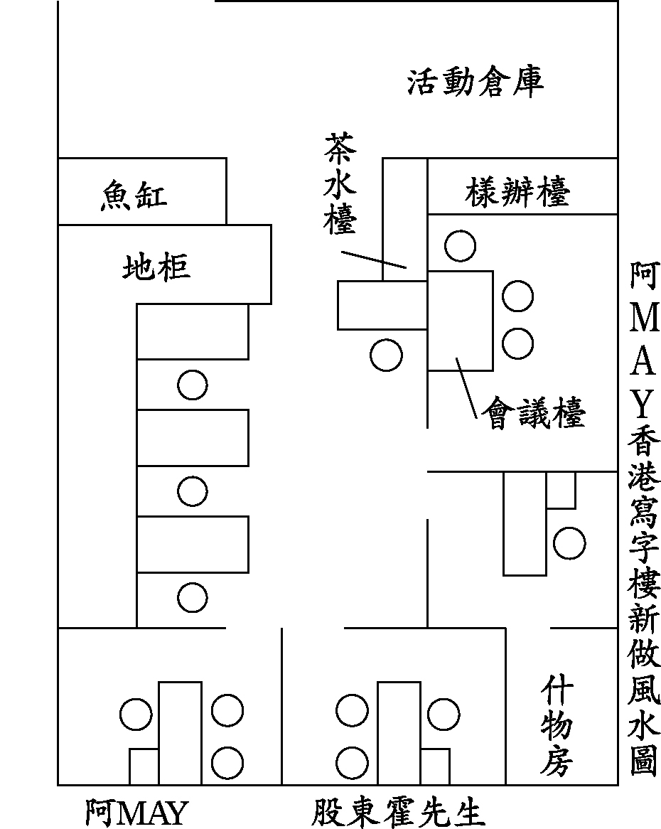 首先,筆者到葵涌和宜合道檢查阿MAY的寫字樓,現場所見只得一個字──亂。整個寫字樓只有靠右手邊的一個小房作為會議及見客室,其它一概全天候開放式,與阿MAY的性格恰好一樣。而幾個員工及股東,全部相對而坐,整個局為全陽局,相對而坐即兩個人中有一個犯無情局。財務亦沒有間格,氣散則財散,卦線失元,巒頭、理氣兩敗,公司不倒閉,實屬有運。筆者根據她們各人命卦,替其設計布局,見下圖。
